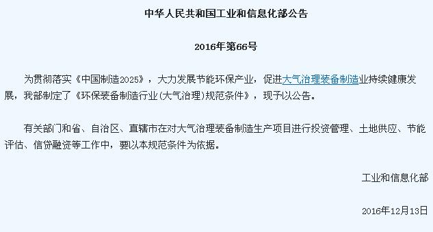 為貫徹落實《中國制造2025》,大力發展節能環保產業,規范行業秩序,引導大氣治理裝備制造行業持續健康發展,工信部制定了《環保裝備制造行業大氣治理規范條件》條例。